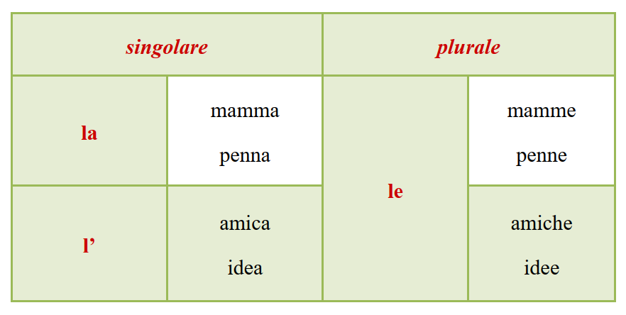 O artigo feminino determinativo é “la” (l’ antes de vogal, como o masculino)