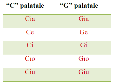 As consoantes “C” e G” têm dois sons possíveis, um som velar como no português casa, quilo, queda; gota, guia, gasto etc.; e um som palatal como no português carioca Tio, leite; dia, jardim. Veja nesta tabela como estes sons são escritos: